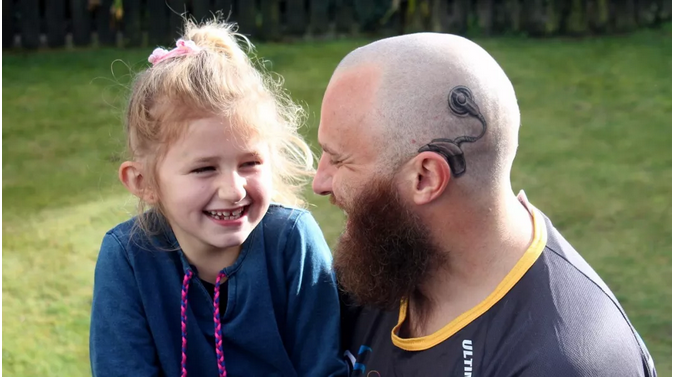 这位父亲为了让女儿喜欢戴人工耳蜗,特意在自己头上纹了只耳蜗。