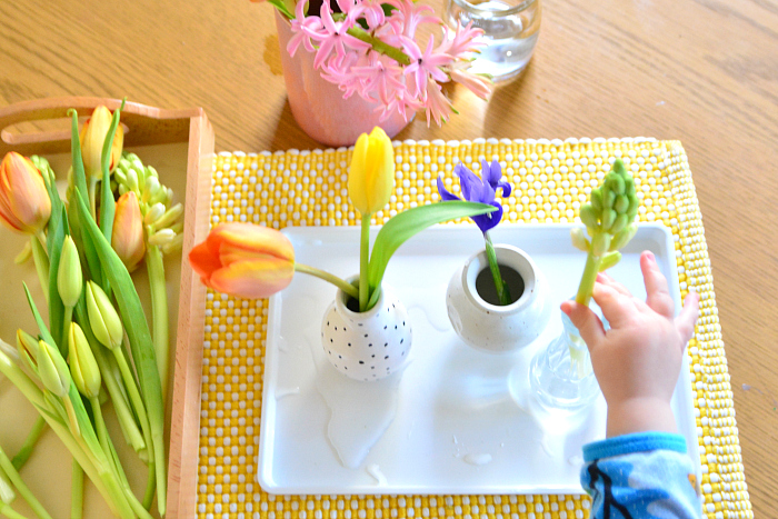 简单的插花活动。孩子在学习倒水的时候可能会把水洒到托盘上。