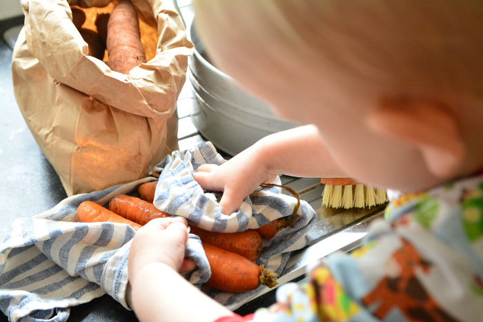 帮助成人打开果蔬包装,并收好。有助于语言学习,孩子在拆包装的时候可以对物品进行命名。